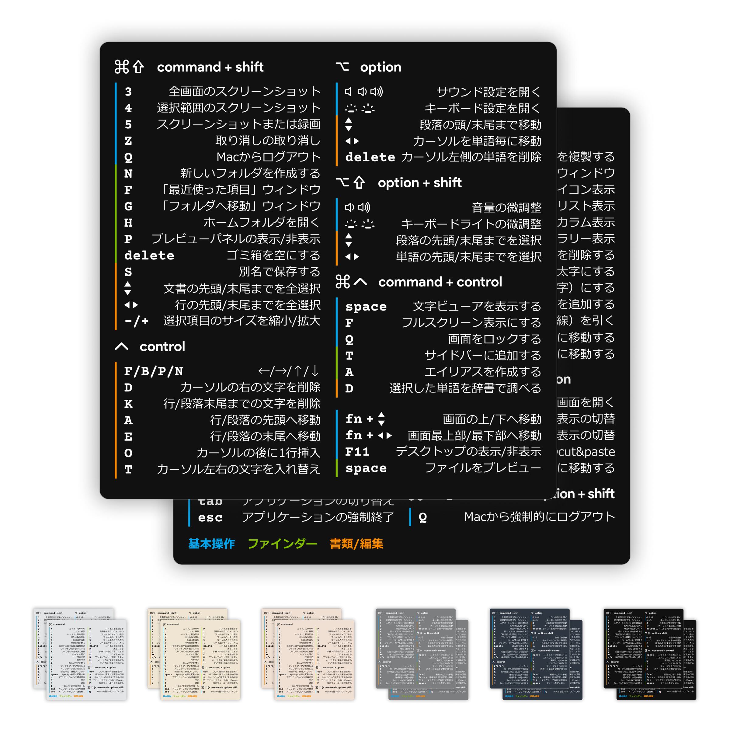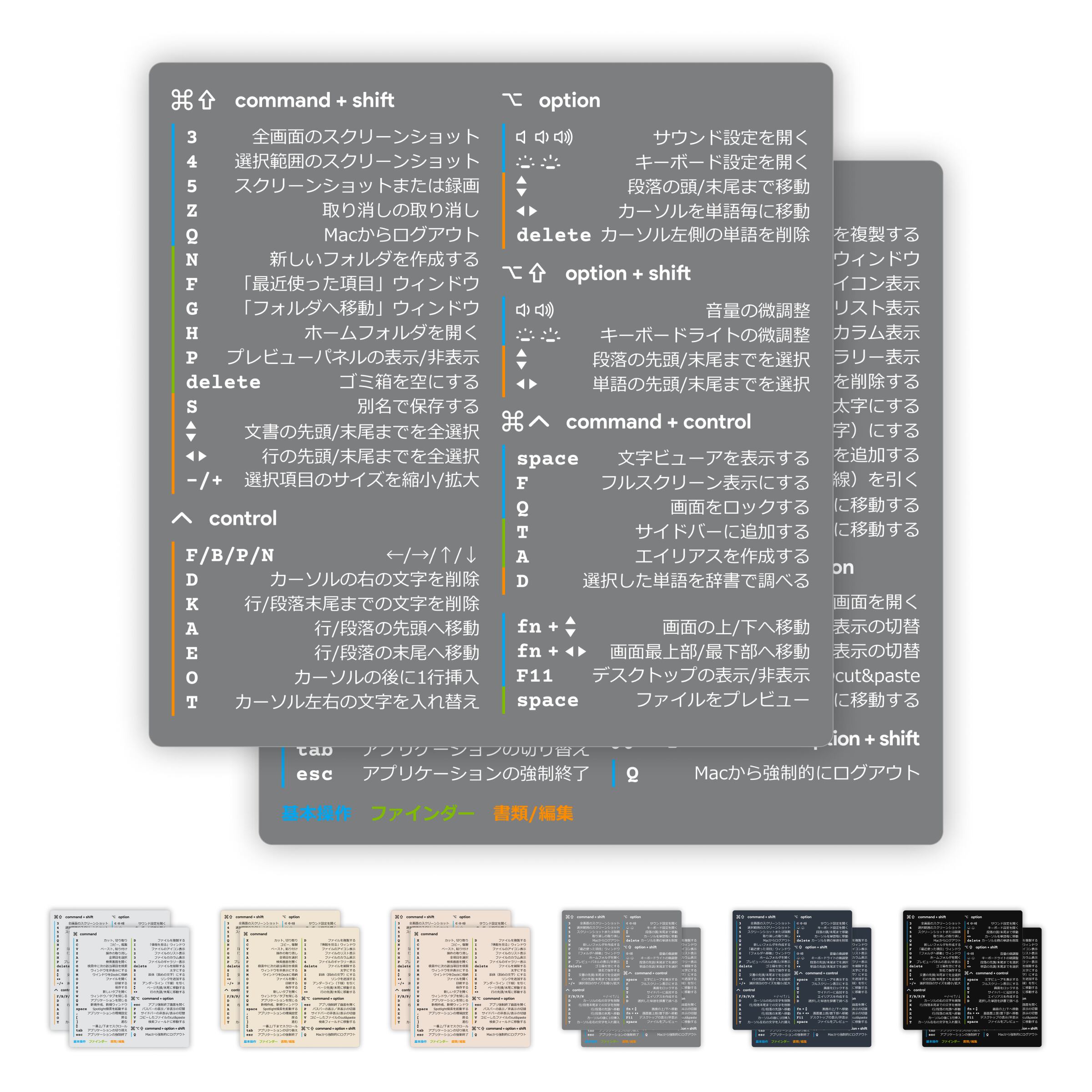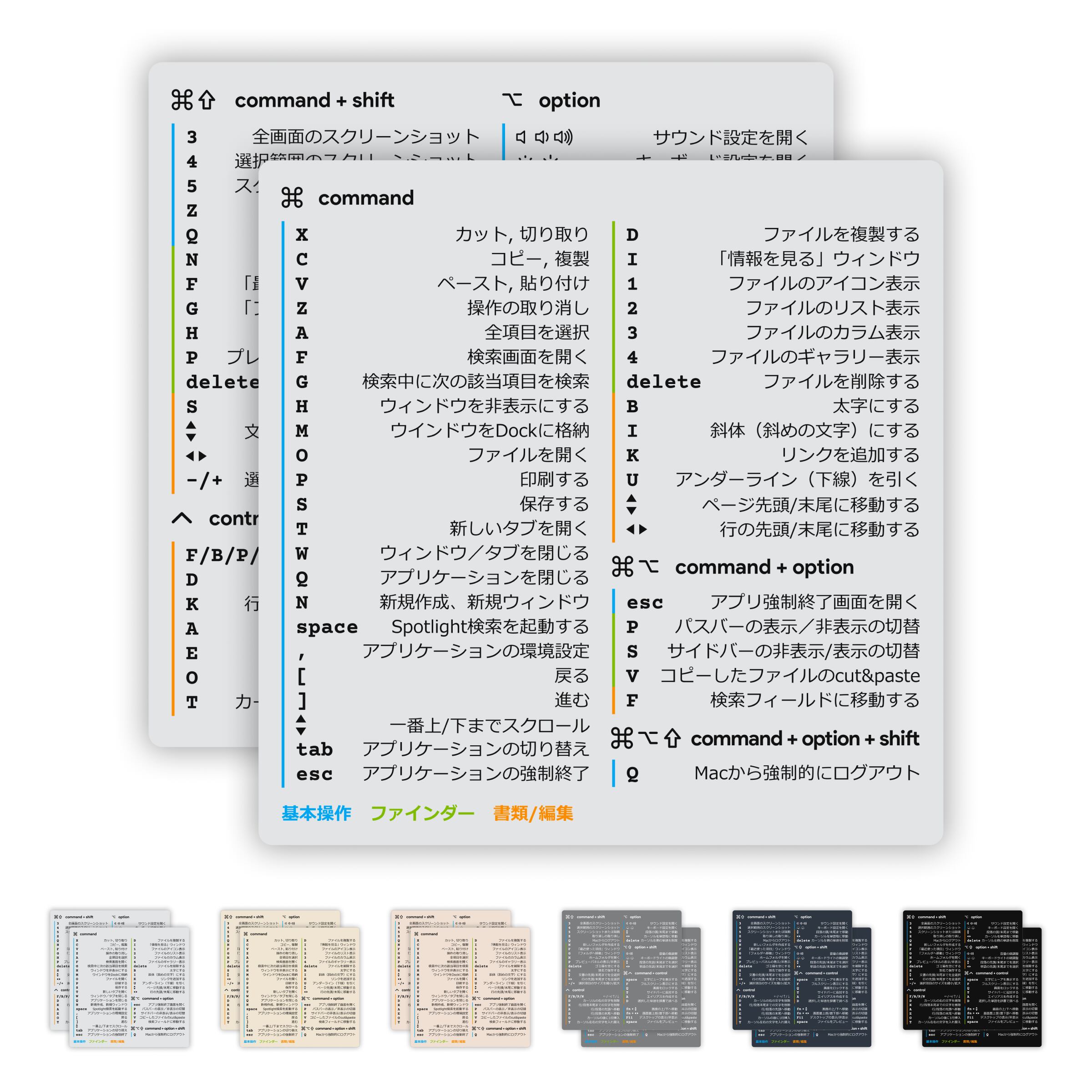 MacOSをより快適に、効率的に操作するための、最もよく使用される基本の必須ショートカットキー80以上を厳選して掲載した、ショートカットキー・コマンド・ステッカー(日本語)です。初心者から中級者・上級者の方まで幅広くおすすめです。